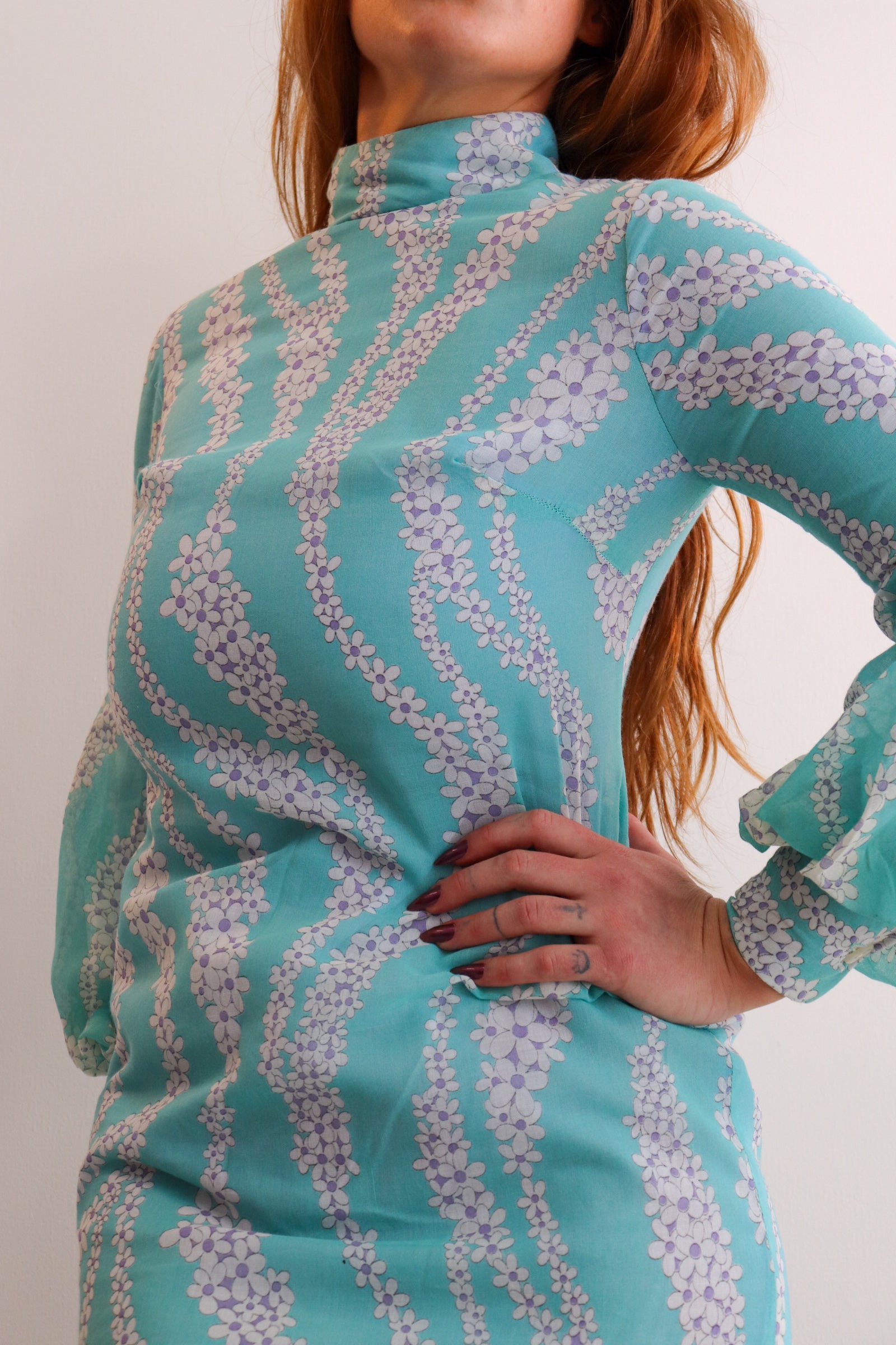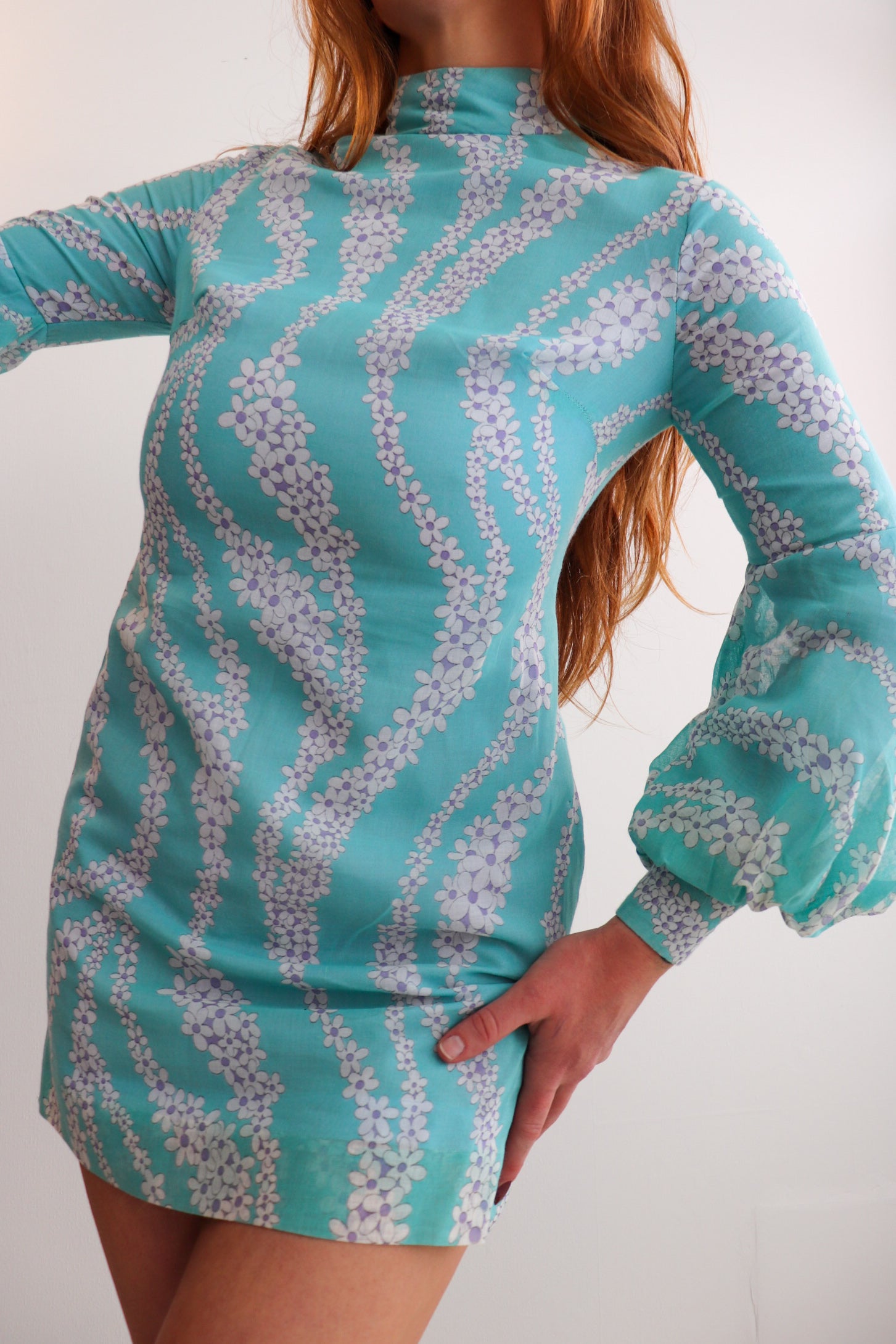 Description: 1960s aqua. floral swirl patterned, high neck, long sleeved mini dress. Layered, lightweight summer piece. Button cuffed, dramatic balloon sleeves. Zip & clip up back. 2IN hemmed bottom, which can be let out if needs to be lengthened.