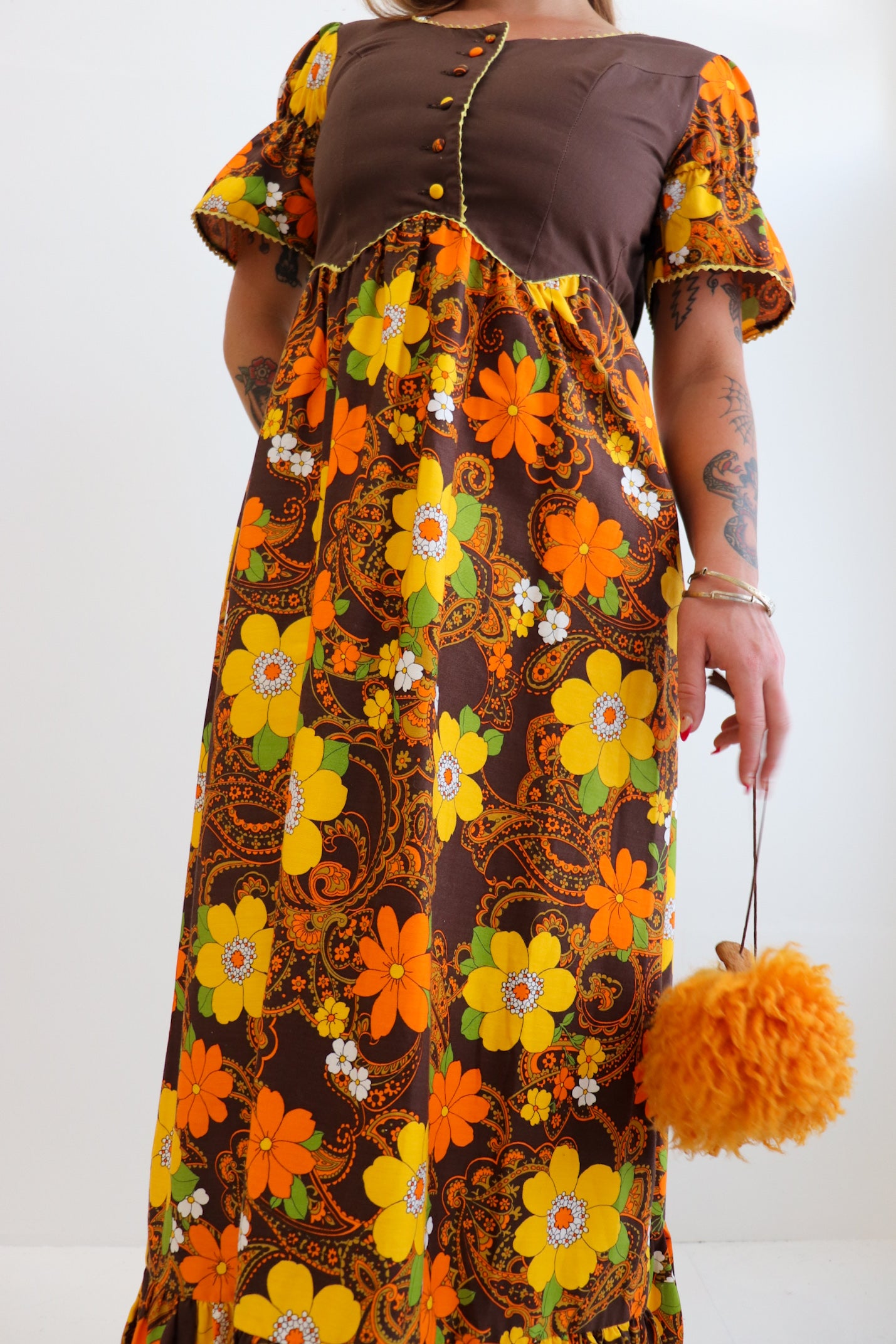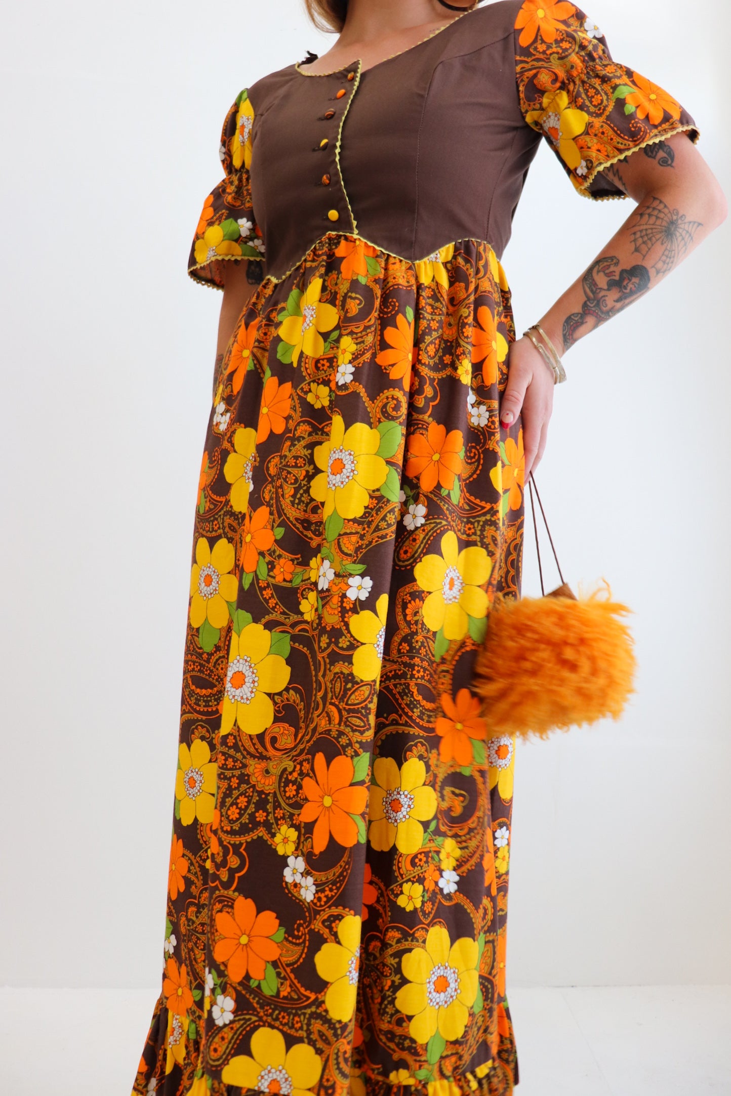 Description: 1970s vintage brown, orange & yellow toned summer, maxi prairie dress. Slightly frilled, mermaid tail, matching the shape of the sleeves. Corset style button up front. Zip up back. Brand is Wilsons Australia.