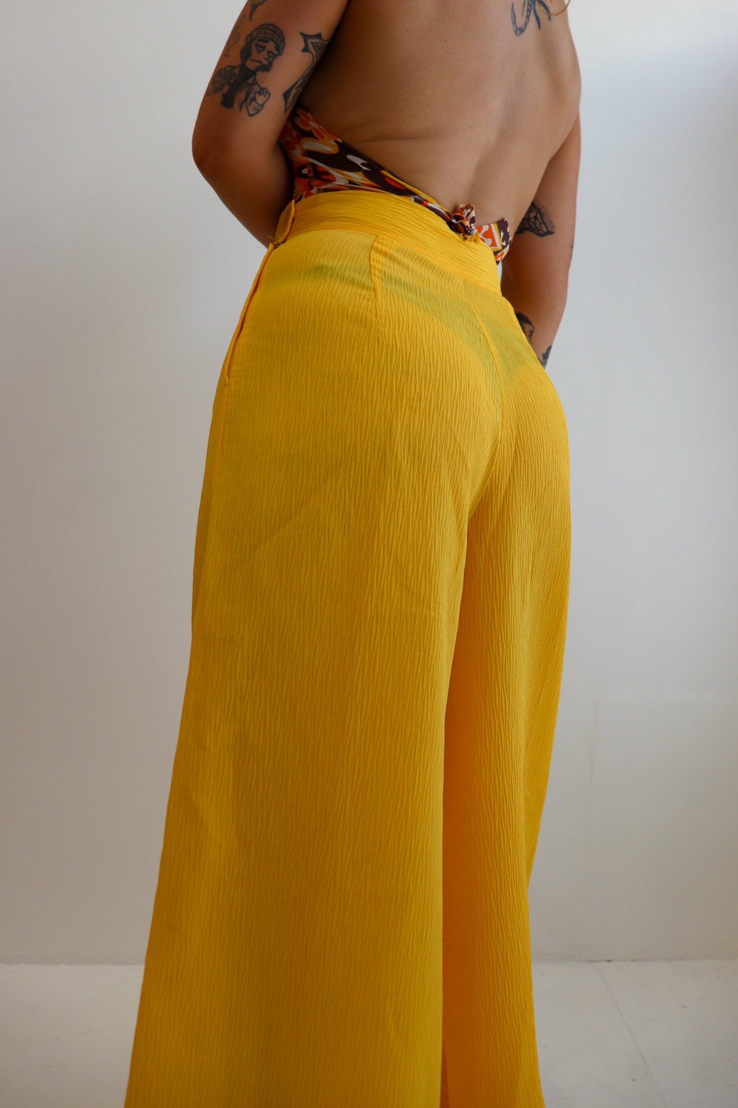 Description: Incredible 1970s vintage bright yellow, two piece flared summer set. Sleeveless, tie / wrap up top, can also be worn open. High waisted mega flare / bell bottoms. Zip & button up front. Both pieces can be styled beautifully separately. Very lightweight fabric.