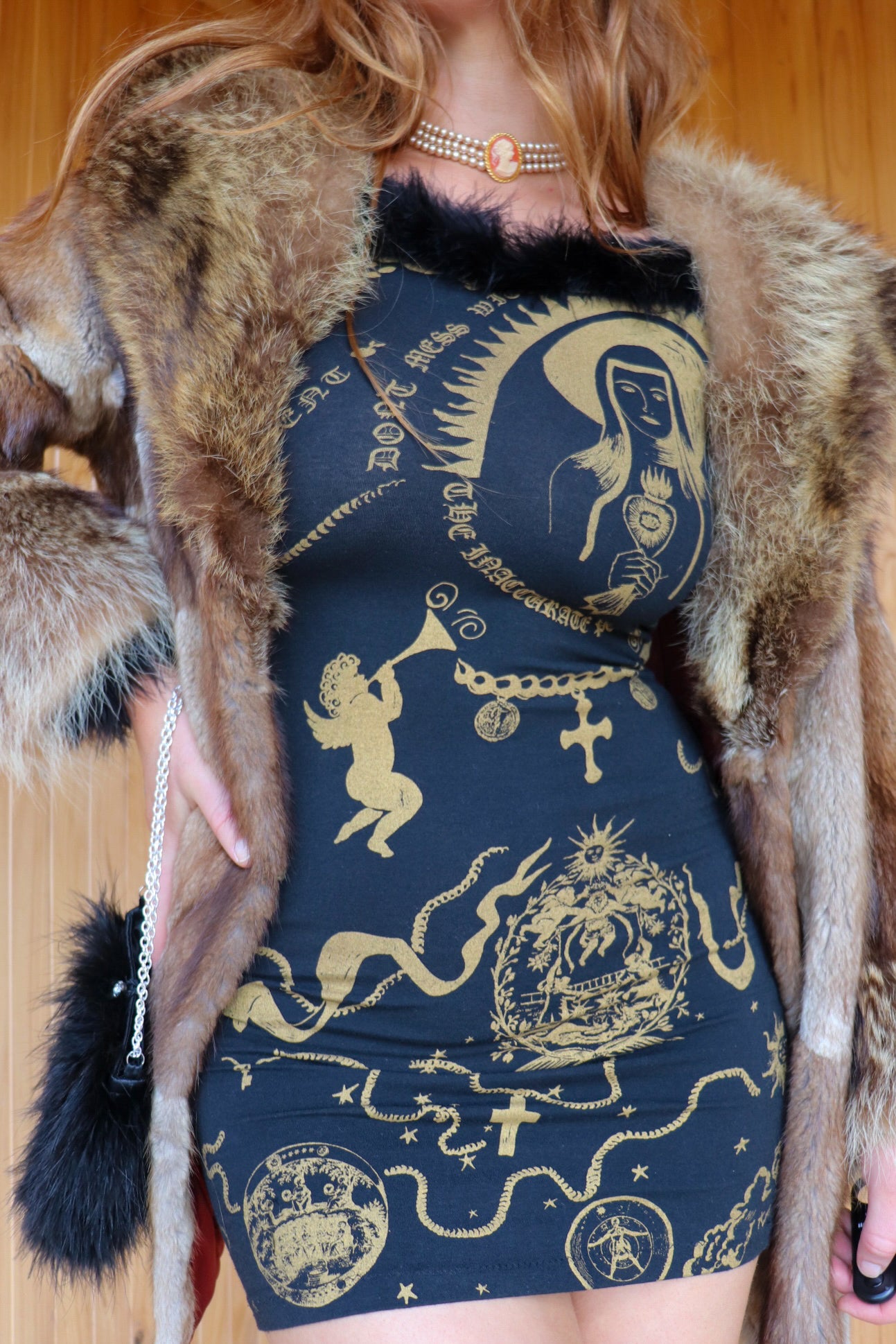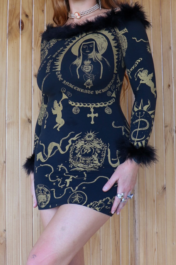 Description: Iconic 1980s vintage gothic faux fur religious iconography mini dress. Black with gold patterning. Arm cuffs & neckline have a soft faux fur. Brand is 'Made by Rosie' made from cotton & lycra. Lightweight, flattering piece.