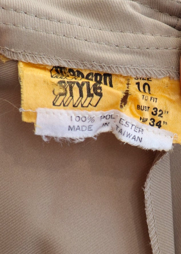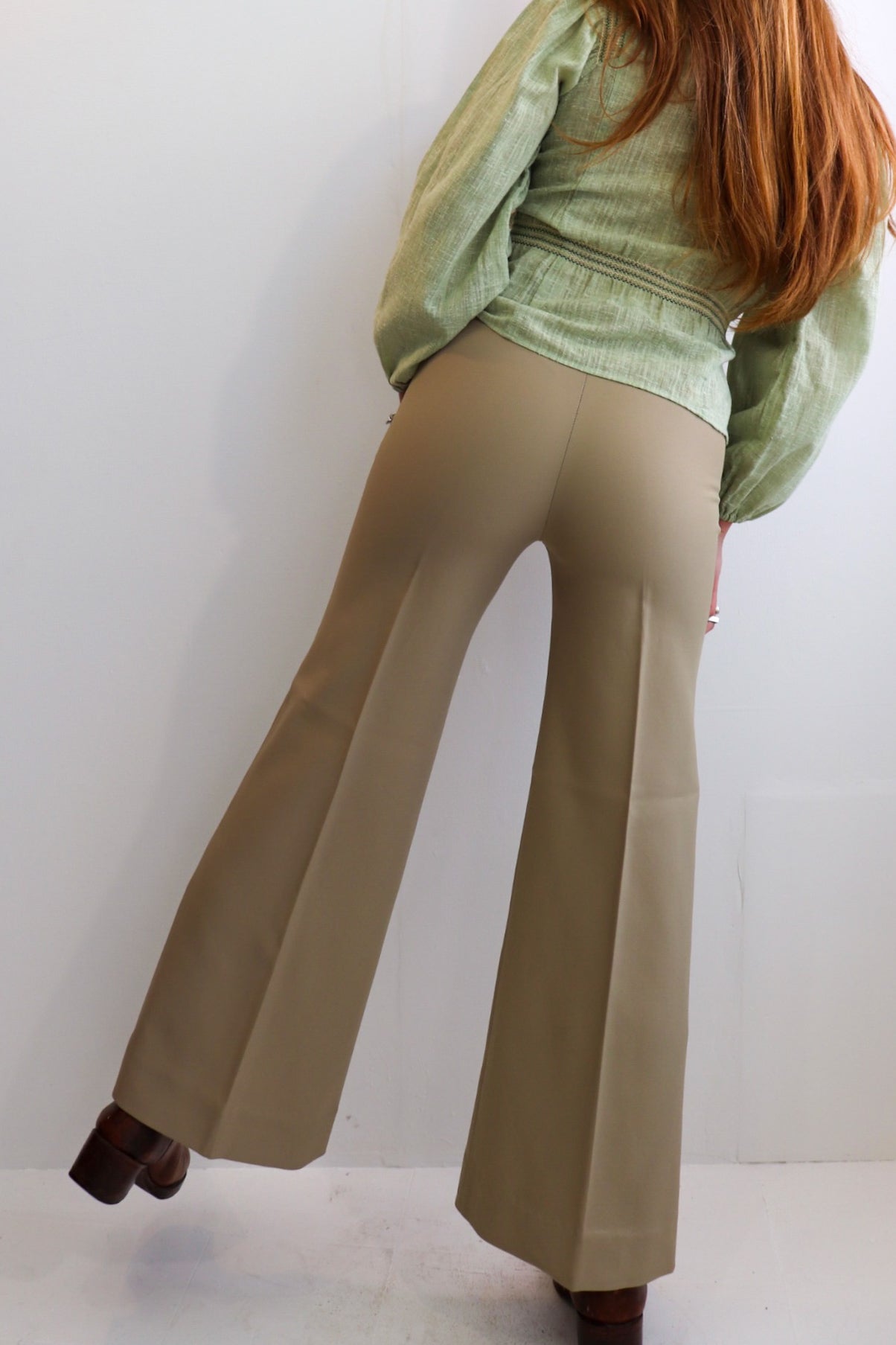 Description: 1970s vintage ecru / beige coloured super high waisted flare pants. Zip & button up front & left hand coin pocket. Faux button latched belt loops on waist. Brand is Modern Style. 100% polyester. Made in Taiwan. Flattering seams down the front. Bells have 2-3IN hem, so can be brought down if need more length on legs.