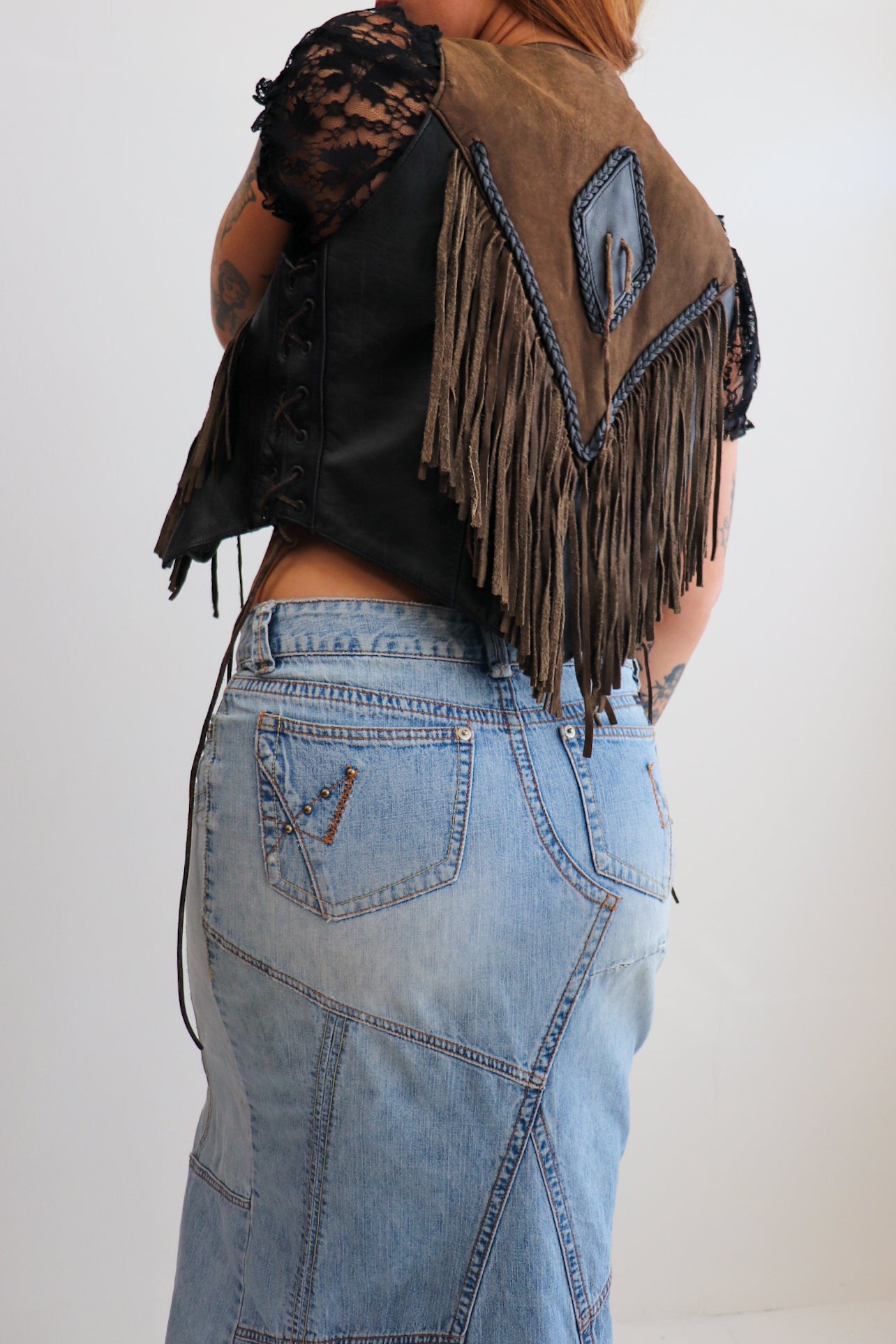 Description: 1990s vintage brown & black leather, fringe, clip up vest. Satin lined piece. Black leather braiding on the front & back. Labeled is G Z.