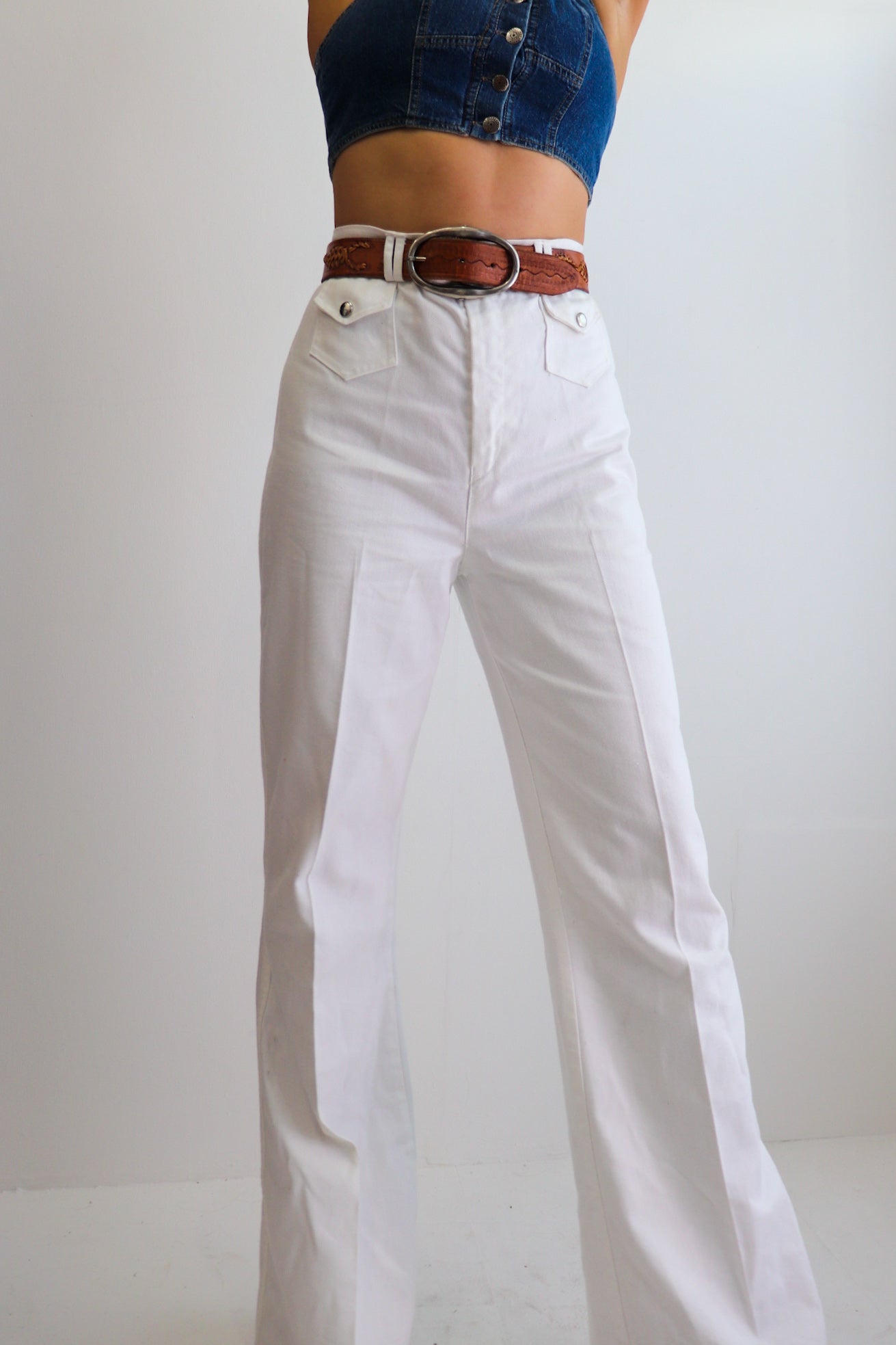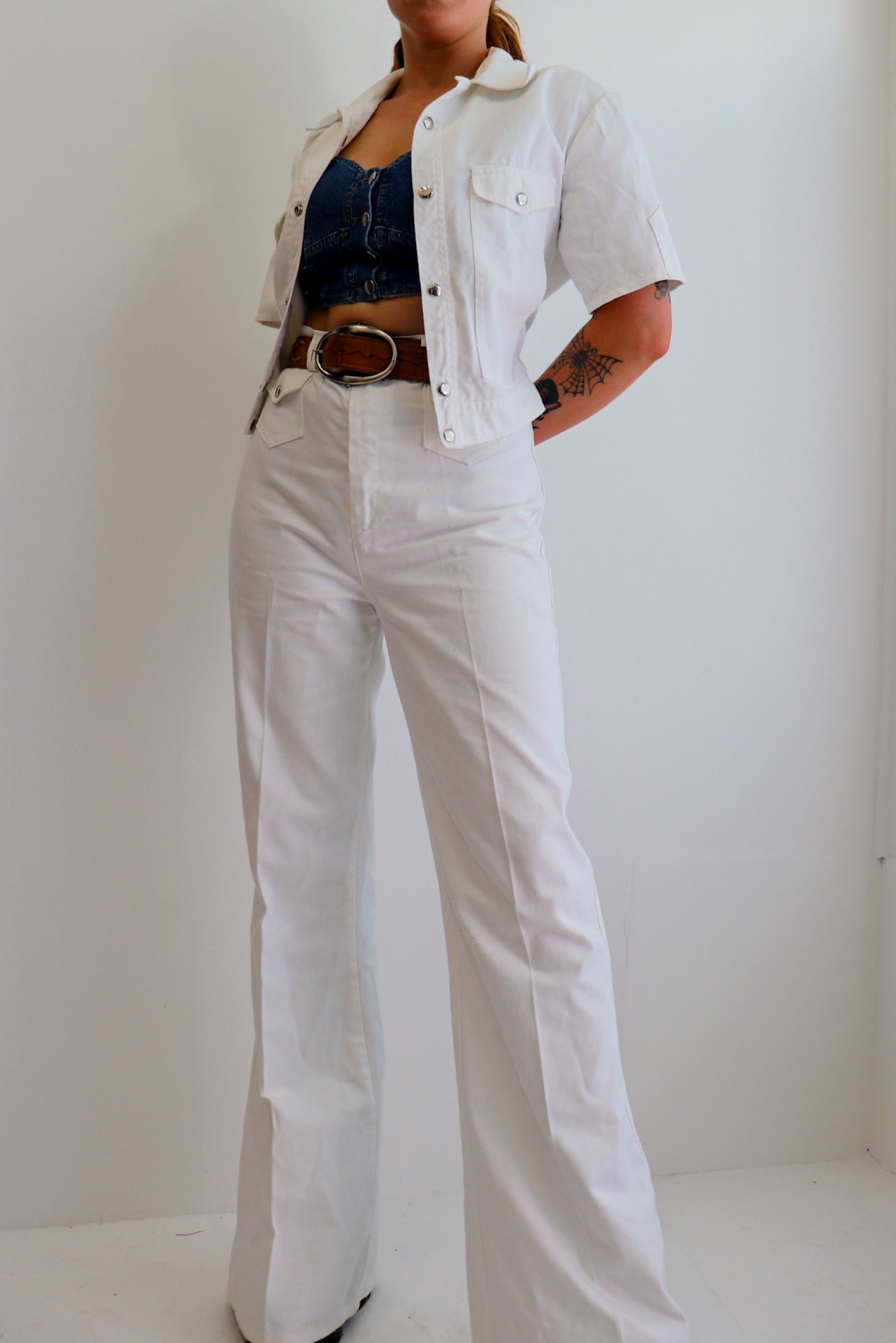 Description: 1970s dead-stock white denim two piece suit / set. Short sleeved, clip up button front & ultra high waisted flares. Zip & button up pants. Two clip up coin pockets on the front & normal pockets on back. Top has two clip up pockets on bust. Neat collar. Tags still attached.