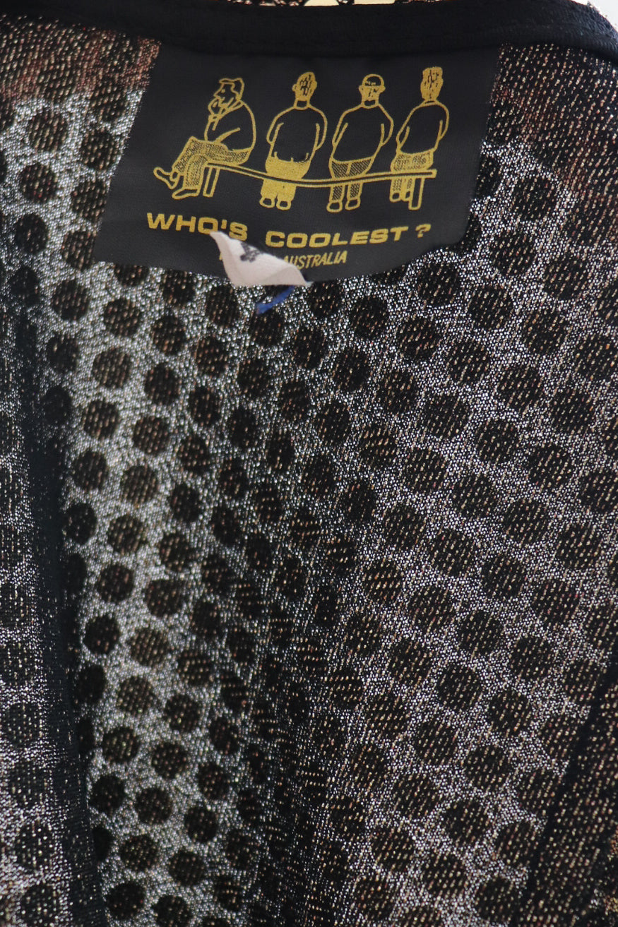 Description: 1970s bright gold, mini halter disco dress. Gold sequin detailing, no layering. Halter, tie up neck. Loose fitting piece, moves without any stiffness & sits comfortably. Zip up back. Brand is Who's Coolest? Australia.