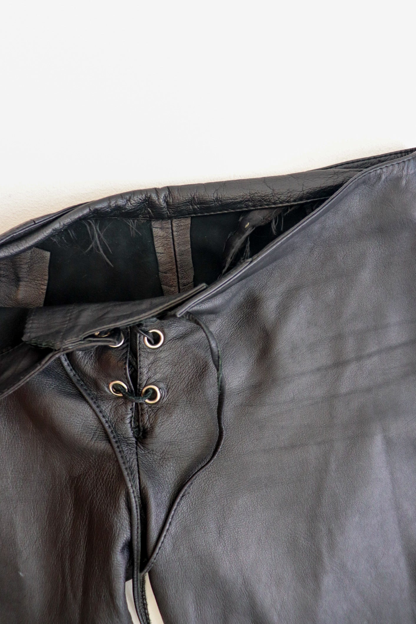 Description: 1990s vintage, black leather mid-rise flares. Corset tie up waist. No lining, lined knee & back.