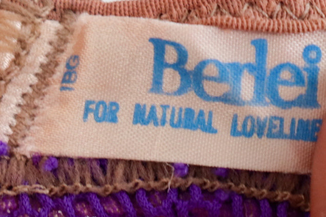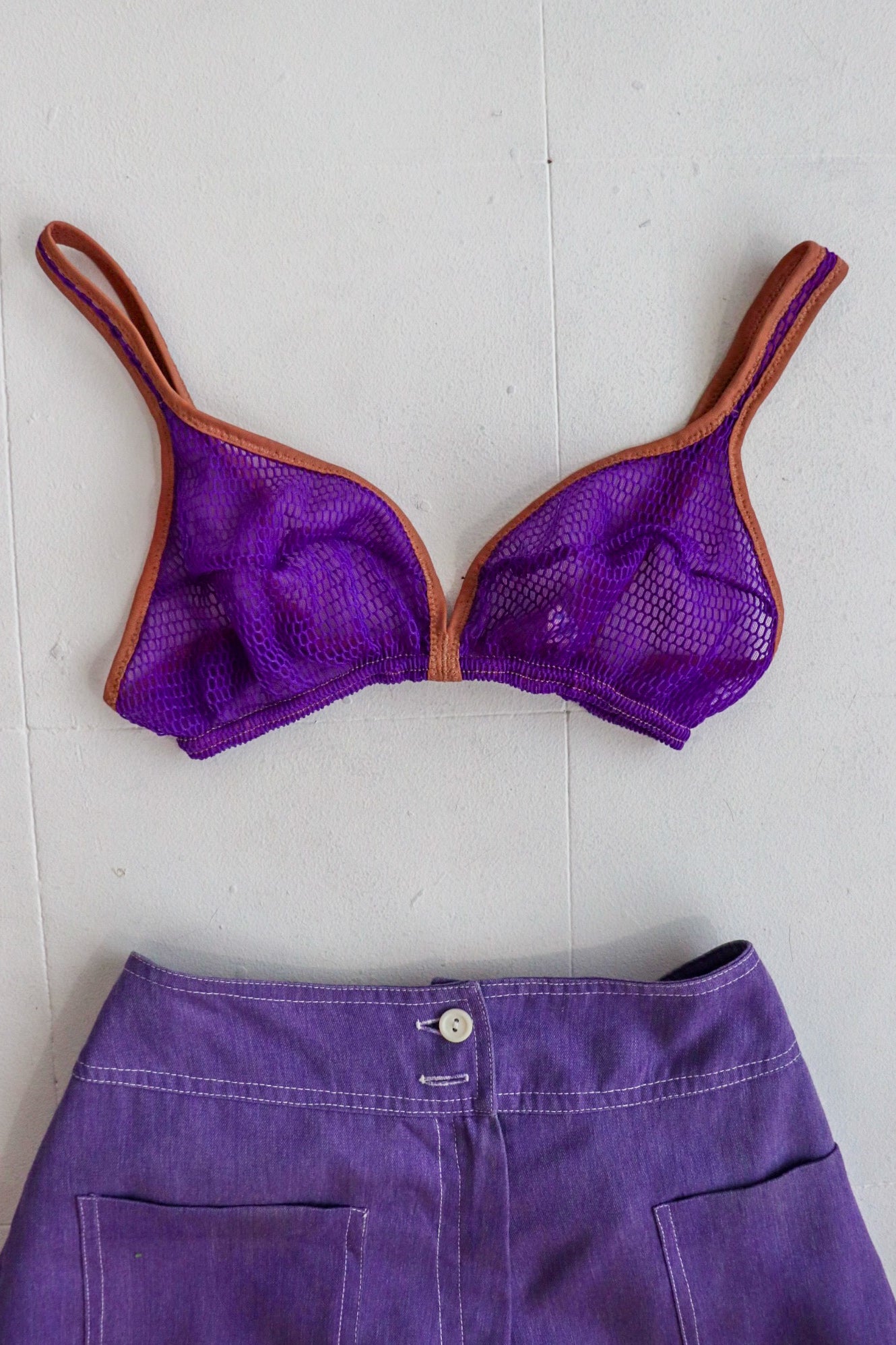 Description: 1980s vintage bright purple fishnet style bralette. Brown redish toned hem. Brand is Berlei. Has good stretch.