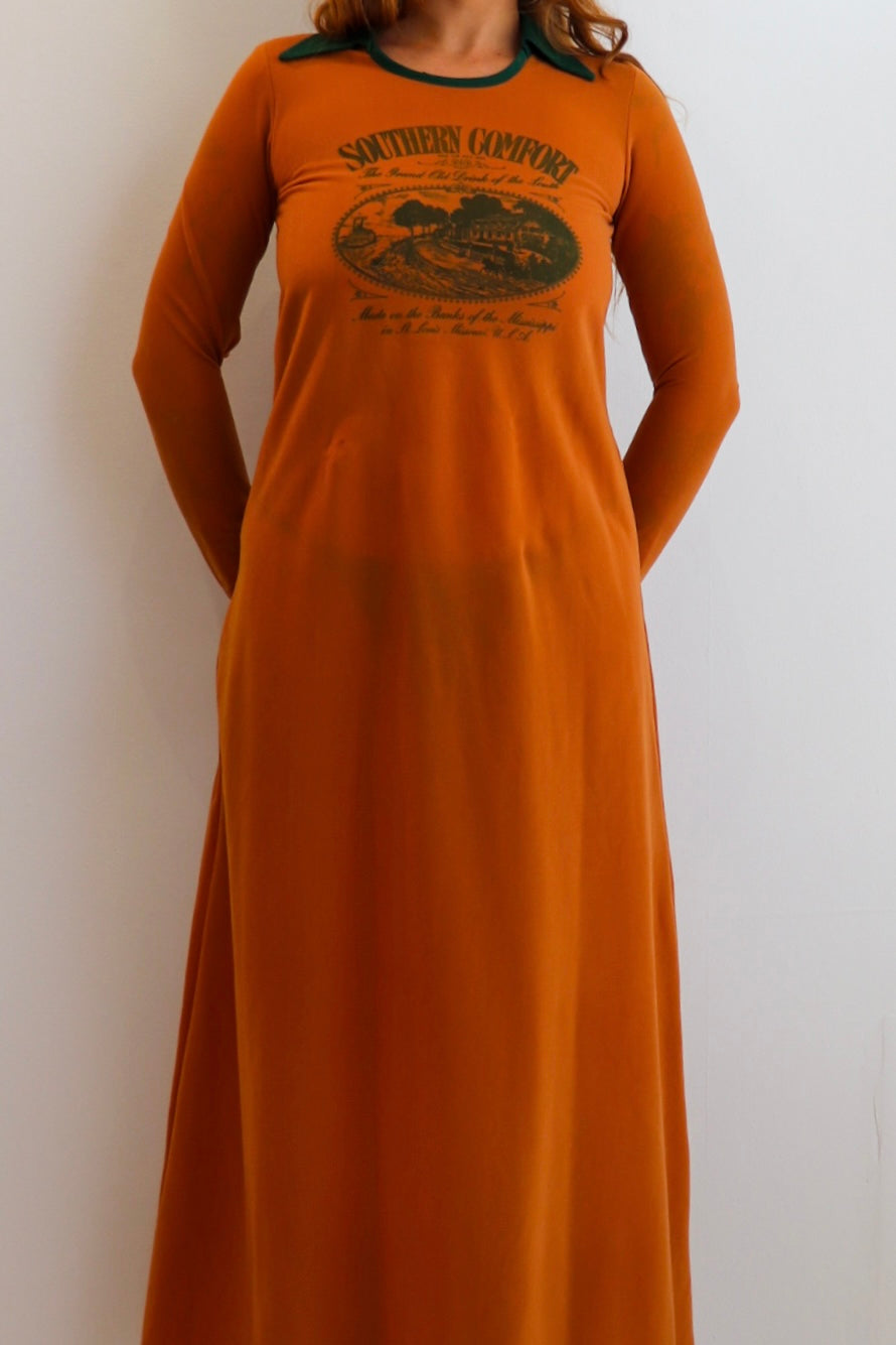 Description: Rare 1970s vintage burnt orange / rust coloured full length maxi prairie dress, with 'Southern Comfort' green logo printed on the front. Dark green pointed collar and neckline. Cuffs have matching green hem.