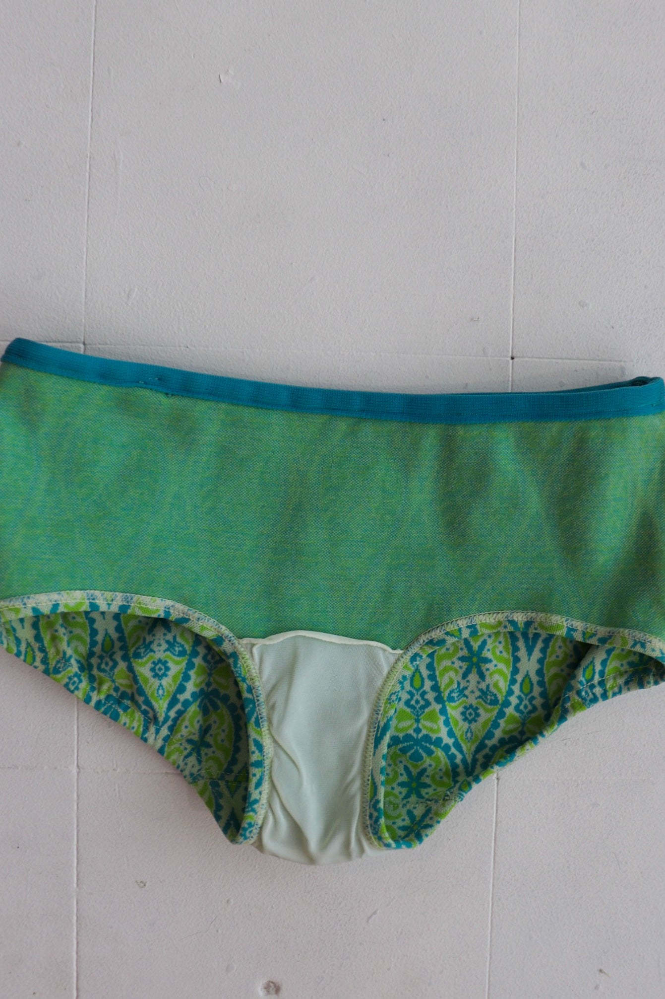 Description: 1970s green, white & blue tapestry patterned stretch, swimwear bottoms. Possibly mens speedo style bottoms, but work as a unisex / womens bottoms or booty shorts. Blue bow detailing on the right side. White mesh lining on crotch.